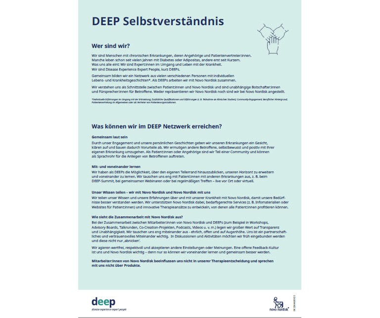 - eine Plattform zu bieten, auf der sich DEEPs untereinander und mit Novo Nordisk austauschen, ihr Wissen und Informationen teilen und gemeinsame Projekte für eine bessere Aufklärung, Entstigmatisierung und Versorgung der Betroffenen entwickeln.